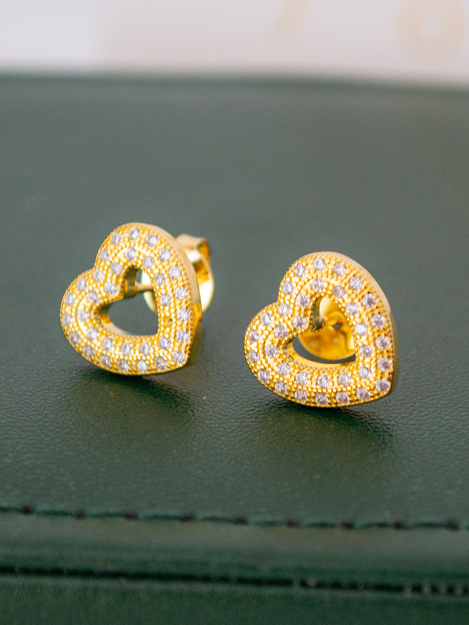 Modelo do brinco: Coração com zircônias cravejadas e centro vazado, e fechamento em tarraxa.