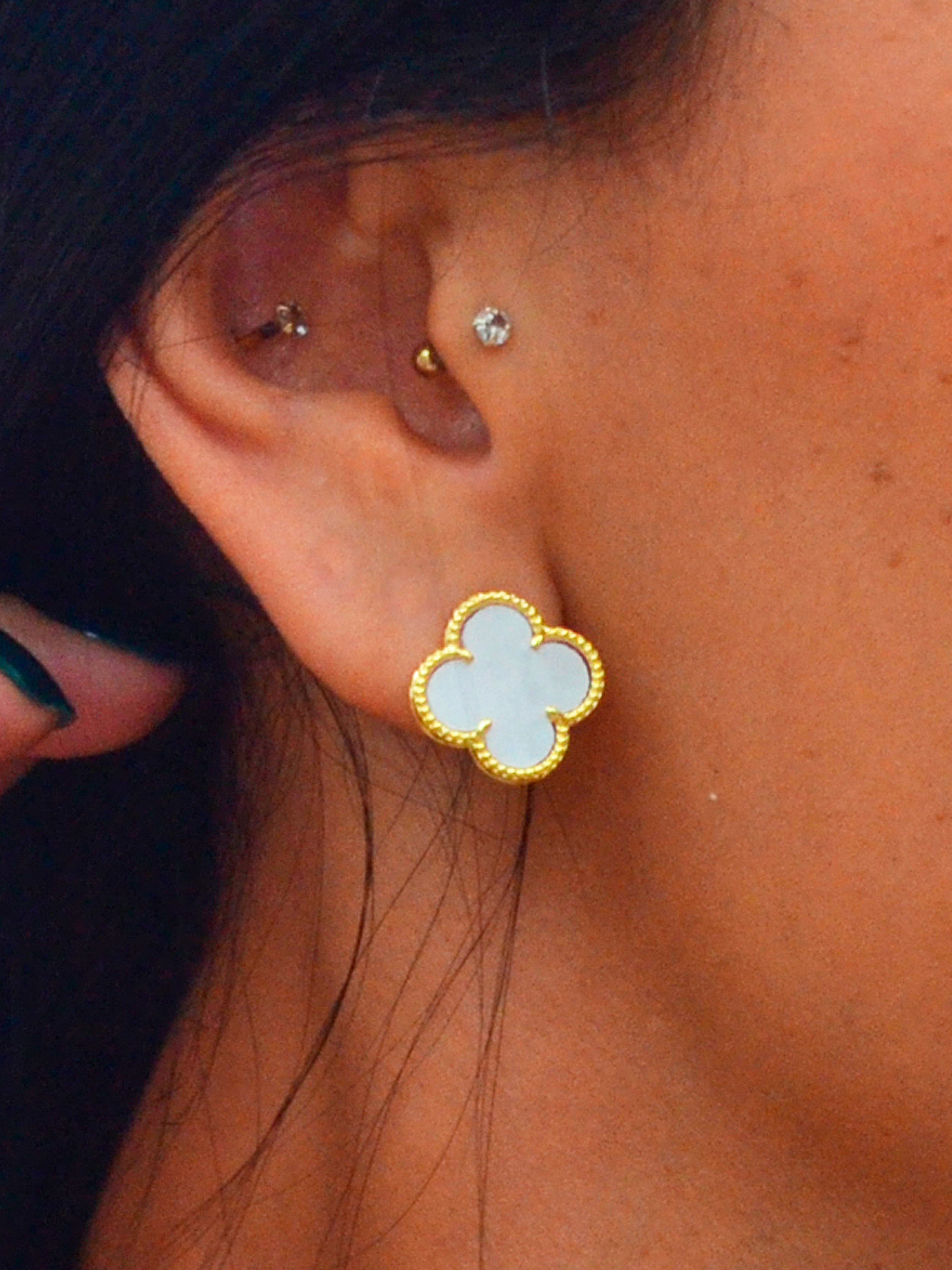 Modelo da brinco: Formato de Trevo na cor branca, com fechamento em tarraxa.