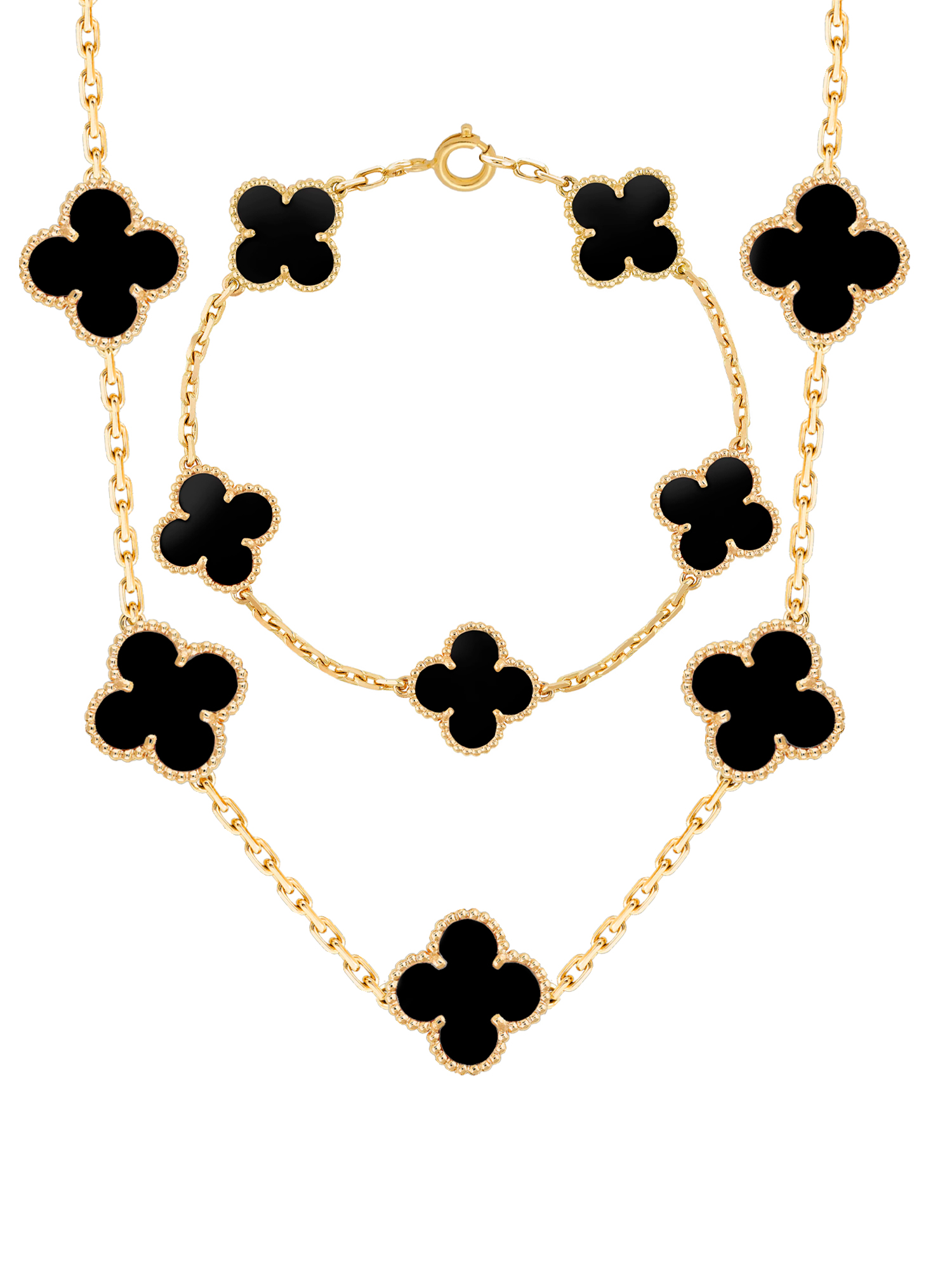 Uma Corrente TREVOS pretos, de 60 ou 45 centímetros de comprimento, com extensor de 5 centímetros e fecho tradicional e uma pulseira TREVOS pretos, de 21 ou 19 centímetros de comprimento e fecho tradicional.