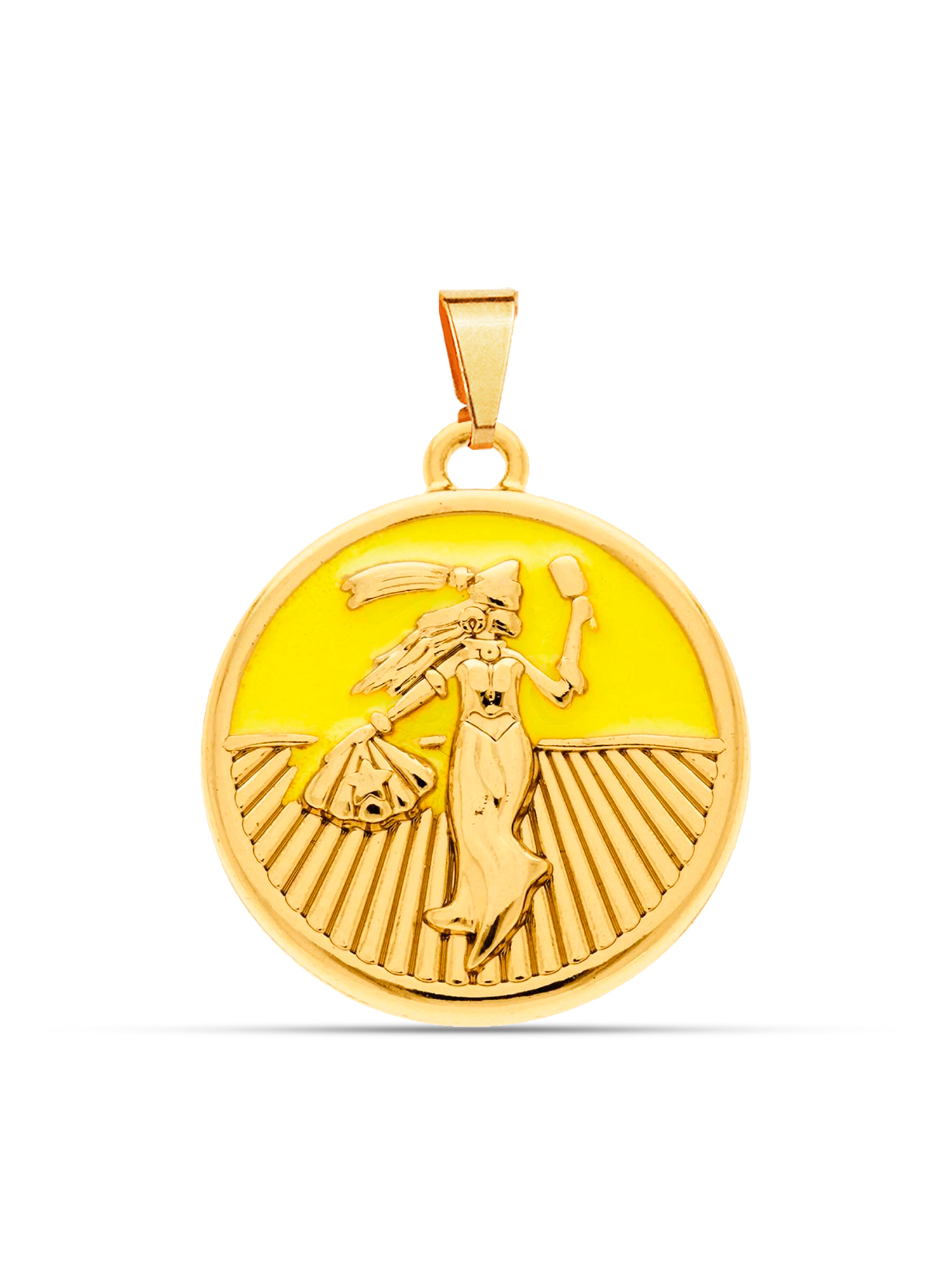 Detalhes do pingente: Pingente em formato de medalha, com a imagem de Oxum e detalhes em amarelo, medindo 2,5 x 2,5 centímetros.