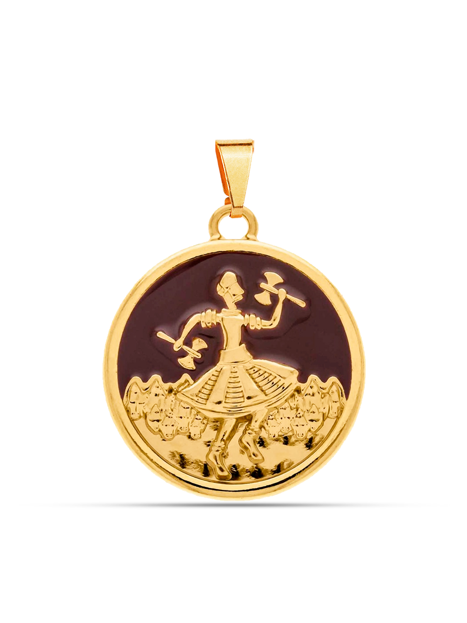 Detalhes do pingente: Pingente em formato de medalha, com a imagem de Xangô e detalhes em marrom, medindo 2,5 x 2,5 centímetros.