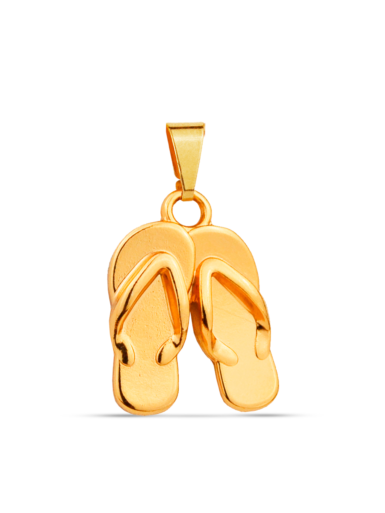 Detalhes do pingente: Pingente em formato de par de chinelos, medindo 2,1 x 1,6 centímetros.