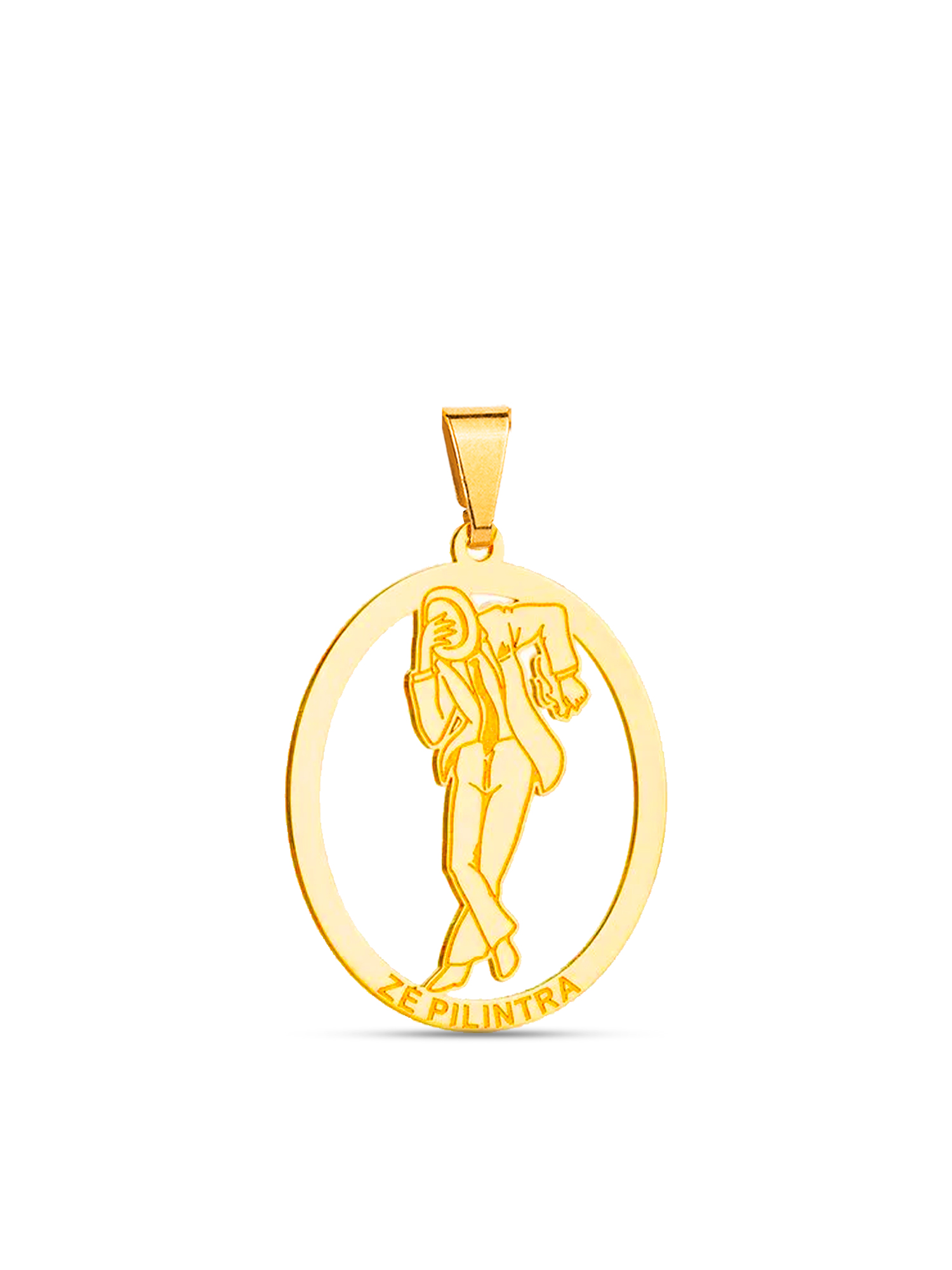 Medidas do pingente: Medalha oval com o desenho de Zé Pilintra e detalhes vazados, medindo 2,5 x 1,9 cm.