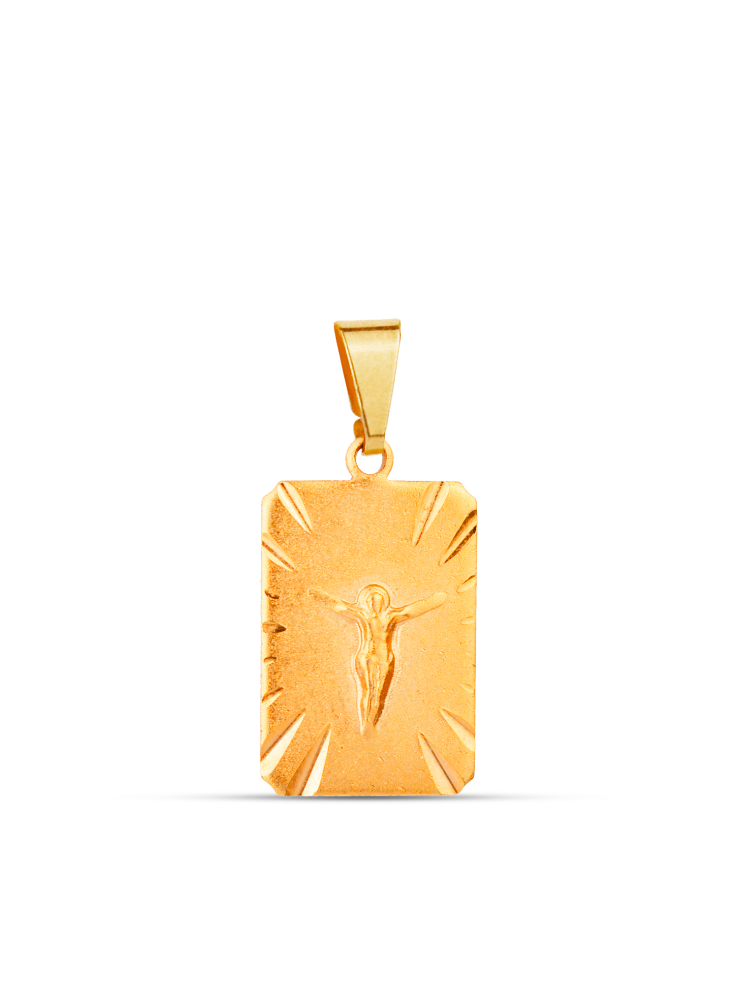Medidas do pingente: Plaquinha com Jesus Cristo em destaque, medindo 1,6 x 1,1 cm.