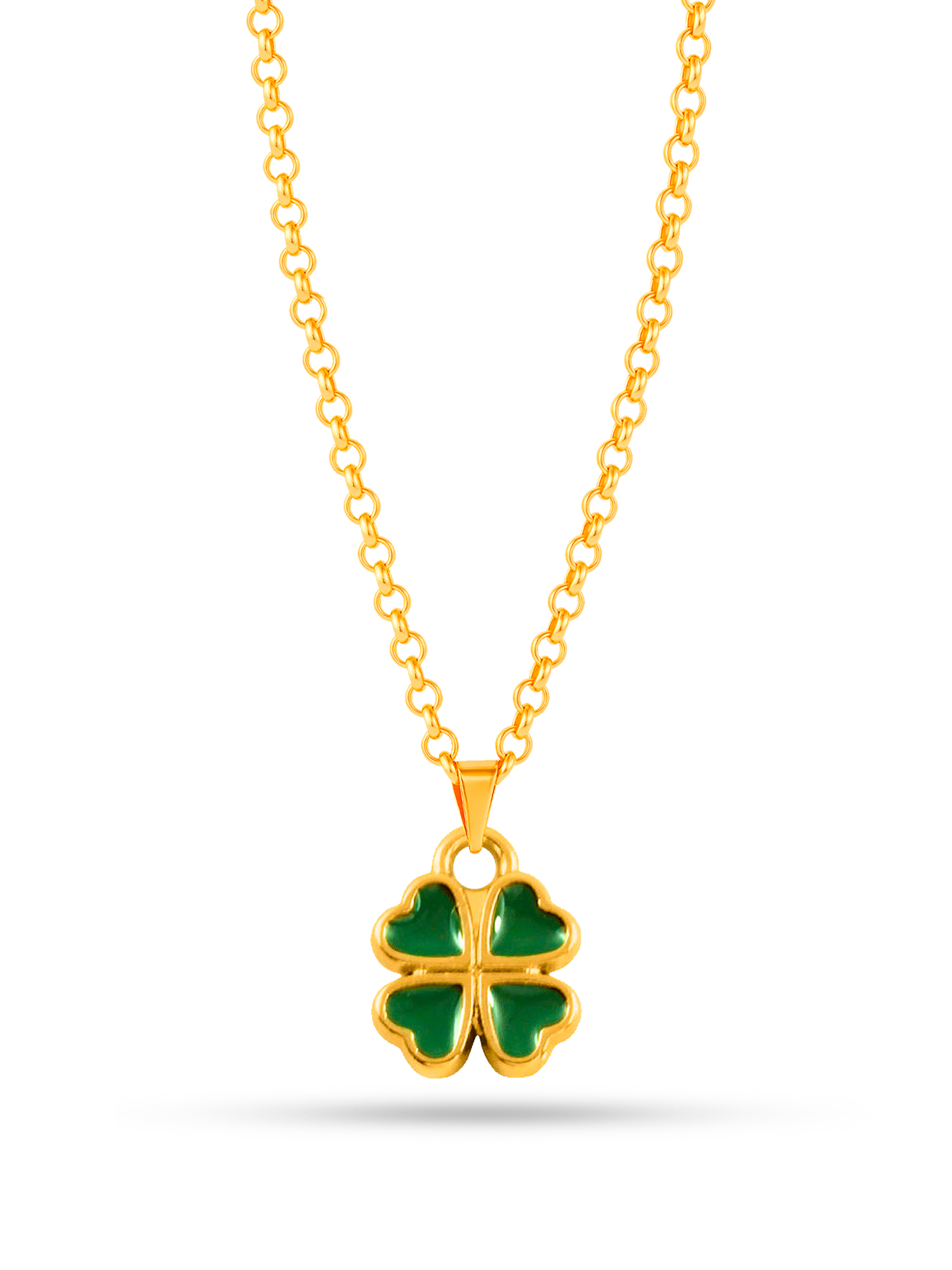 Detalhes do pingente: trevo, colorido com resina verde, de 1,2 x 1,2 cm.